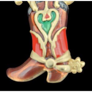 Excellent vintage pre-owned condition, cleaned, no blemishes, like new, see all photos for details and condition, Vintage Christmas Cowboy Boot Brooch Pin Cat & Gifts Gold-Tone Enamel 2"