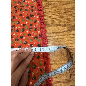 Add a touch of nostalgic charm to your holiday table with this delightful set of vintage Christmas fabric napkins. Each napkin measures approximately 15x16 inches and features a vibrant red background adorned with a festive pattern of green Christmas trees, wreaths, white floral, and other holiday motifs. The edges are beautifully finished with a delicate red lace trim, enhancing their vintage appeal.