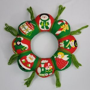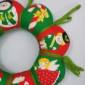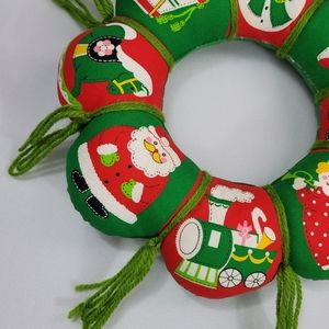 Vtg Christmas Fabric Stuffed Wreath - Holiday Home Decor - Red Green - Snowman Candy Cane Nutcracker Angel Train Santa Rocking Horse Drum