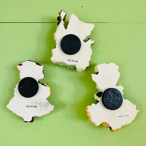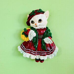 Set of three vintage Xmas cat magnets. Two of the white kittens in this trio are dressed in Victorian Christmas style attire and the other kitten is dressed in Christmas Greek attire. They are sturdy plastic measuring approximately 3.25" long and 2.25" wide. All are in good vintage condition.