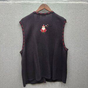 A professionally crafted holiday vest featuring an intricate array of festive gnome graphics and decorative embellishments. The garment offers a sophisticated take on seasonal attire, combining classic design with whimsical Christmas-themed embroidery.