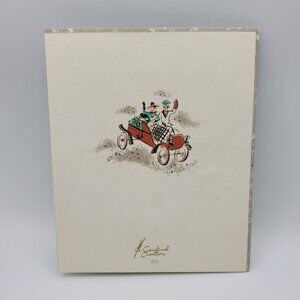 A whimsical mid-century holiday card featuring a charming illustration of two stylized figures in a vintage car adorned with Christmas gifts and holly, capturing the festive spirit of bygone years.