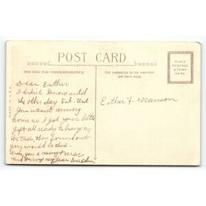 This charming vintage Christmas postcard features a delicate holiday scene framed by holly and poinsettia embellishments. Two colorful birds hover near a quaint winter landscape with snow-covered trees and a cozy cabin, evoking nostalgic warmth and festive cheer. The front includes a poetic Christmas greeting in a classic stylized font, enhancing its timeless appeal.