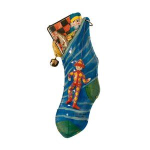 Pressed tin stocking ornament designed by Linda Sickman, featuring vibrant details and measuring approximately 4.5 inches. Ideal for collectors or holiday décor.