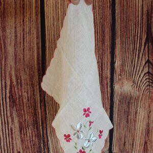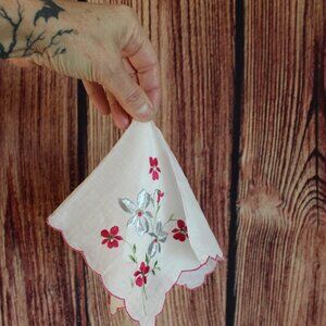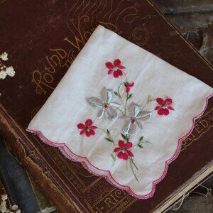 Charming vintage Holiday handkerchief. Silver and pinkish red poinsettias with red trim on a white background. Linen, scalloped edges. Measures approx. 10.75" square. Has been gently and lovingly laundered and ironed by yours truly.