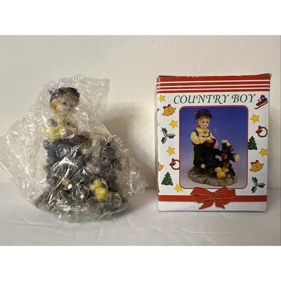 New In Box Vintage Christmas Holiday Country Boy Sitting on Fence Feeding a Baby Chick Figurine 3.5" Resin By Kingsbridge International