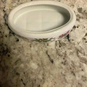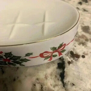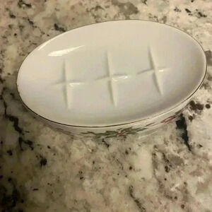 Vintage Christmas Holiday Soap Dish with red ribbon holly berries with gold trim. No chips or cracks. 5 1/4” w x 3 1/8” l x 1 1/2” t SFPF HOME.