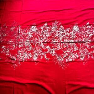 Vintage Christmas Holiday tablecloth sized as a buffet table rectangle - vivid red with a center design of lovely golden leaves leaves that runs the length of the cloth. This is a gorgeous tablecloth - my photos do not do it justice! In excellent condition - gently used and well cared for - ready to grace your festive table today!