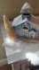 Embellishments: The decoration includes two green bottle brush trees on either side of the entrance.