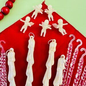Vintage lot of mid century icicle ornaments and five miniature plastic angels for crafting. Over 30 pieces in all! All are plastic. The icicles vary in size, approx 5" long. In good vintage condition.