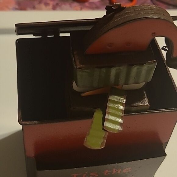 Pre-owned in good condition. The metal box is approximately 4 inches tall and about 4.25 inches long and has an approximate depth of 3 inches.