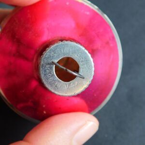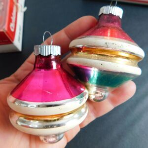 Shiny Brite Ornaments, 2 Stripe Glass "Top" Ornaments, both show some tarnish from age but are in solid condition.
