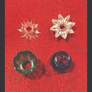 Set of 32 mid‑century translucent plastic reflectors for Christmas lights in six vibrant colors and two designs. including 28 flower petal designs and 6 clear starbursts. Designed to slip over bulbs, they add a colorful or frosty glow with retro charm.