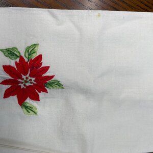 Handmade vintage linen tea towel adorned with hand-embroidered chrysanthemums, perfect for Christmas decoration. Exudes a charming, festive feel with its floral pattern and white and red colors.