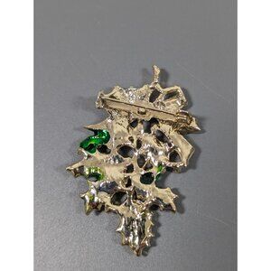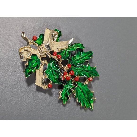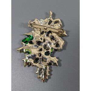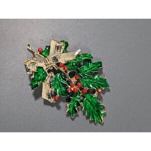 Vintage Christmas Mistletoe Green Leaf Bow Pin Brooch Gold Tone