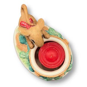 This vintage Christmas mouse and tree votive candle holder is a charming addition to any holiday decor collection. Made by Current Inc. in the 1980s, it features a delicately crafted porcelain mouse holding a Christmas tree, with space for a small votive candle to be placed inside (unused red votive included). The intricate details of the mouse's fur and the tree's ornaments make this a truly special piece.