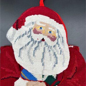 Vintage Christmas Needlepoint Stocking Santa Claus Toys Red Hanging Loop Figural