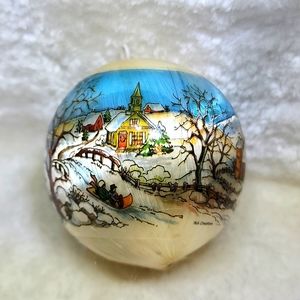 Vintage Christmas Ornament. Satin silk spun thread wrapped with plastic. Merry Christmas by Ina Creations. Christmas in the country with beautiful houses, pond and kids sledding.