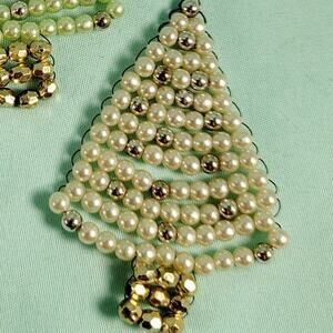Vintage Christmas Ornament Beaded Faux Pearl Trees Cream Green Gold Handmade