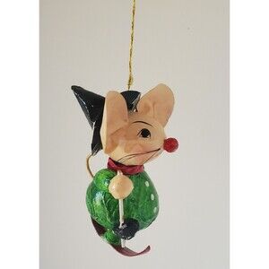 Vintage Christmas Ornament Paper Mache Witch Mouse On Skis Taiwan 1980s Folk Art