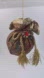 This exquisite vintage Christmas ornament is crafted in the charming likeness of a traditional potli bag. The pouch-like body is gathered at the top, creating a soft, ruffled silhouette. It is made from rich, patterned fabric in warm hues of gold and red, with delicate hints of blue woven throughout, evoking an antique elegance. A shimmering gold rope cinches the top, forming graceful tassels that drape down, enhancing the ornament's refined character. At the center, a striking red jewel-like embellishment adds a touch of festive opulence, making this piece a standout addition to any holiday décor.