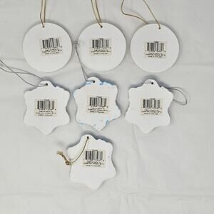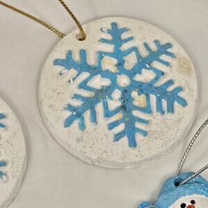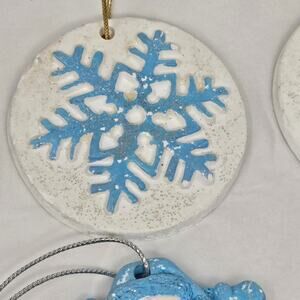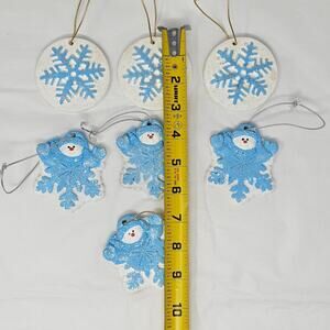 Vintage Christmas Ornaments Snow Flake Blue White Ceramic Hand Painted Set Of 7