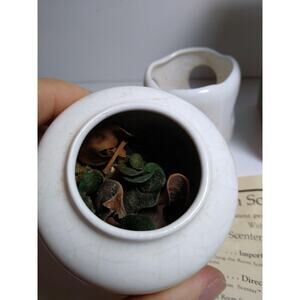 Used item. Still has old potpourri in base. No candle. 4.5" tall and 3" wide. Good condition. Box shows sticker damage and age wear.