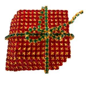 Vintage Christmas Present Gift Pin Brooch Red Rhinestones With Bow
