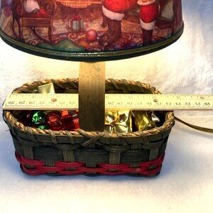 This charming vintage Christmas table lamp features a festive Santa and winter scene on its punched litho shade, offering a nostalgic holiday ambiance. Its woven basket base adds rustic charm, adorned with small decorative presents, making it a delightful addition to holiday decor.