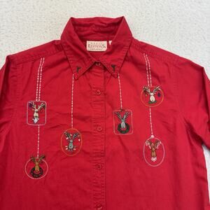 Vintage Christmas Shirt Womens Small S Red Reindeer Button Up Long Sleeve