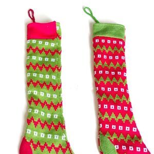 Vintage Christmas Stocking Hand Knit Heirloom Red Green Stripe Set of 2
