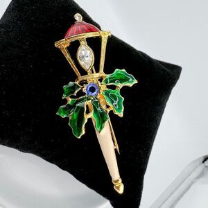 Illuminate your holiday style with this stunning vintage streetlight brooch. The intricate design, featuring a gleaming lamppost adorned with sparkling rhinestones & a vibrant red & green enamel finish, creates a truly enchanting piece. Perfect for adding a touch of vintage timeless glamour to your holiday wardrobe.