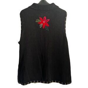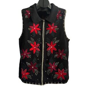 Vintage Christmas Sweater Vest Black Poinsettia Embroidered Zip Front Holiday