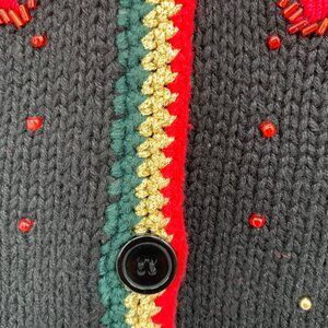 Vintage Westbound black Christmas sweater vest featuring bold red poinsettia embroidery with beaded accents. Made from a ramie-cotton blend and finished with festive trim in red, green, and gold. A charming holiday statement piece in a rare small size, perfect for layering at seasonal gatherings or festive photos. Made in China and looped in Hong Kong.