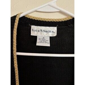 Cozy up in this vintage Norton McNaughton cardigan sweater, perfect for the holiday season. The black cotton and ramie blend knit fabric makes for a comfortable and warm addition to your winter wardrobe. The crew neck and long sleeves provide a classic and timeless look, while the tight-knit fabric and button accents add a touch of elegance.