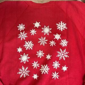 This is an adorable, red, vintage “ugly Christmas sweatshirt” featuring a bear, snowflakes and the text “Let it Snow” by Tultex. Allover print graphics on front, back and arms. Puffy paint! Size Large. Some light discoloration on the front to the side of the bear. Please see photos for more detail. Armpit to armpit approx. 21.” Shoulder to hem approx. 27.”