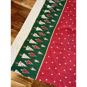 Add a touch of vintage charm to your holiday table with this rectangular tablecloth featuring a festive Christmas tree pattern in red, green, gold, and white. Made from a comfortable cotton blend material, this tablecloth measures approximately 60x70 inches, making it the perfect size for medium-sized tables. The tablecloth is in good condition and will make a lovely addition to your Christmas decor. The brand for this tablecloth is Kmart.