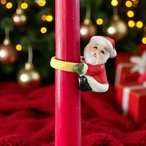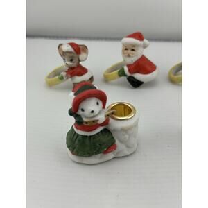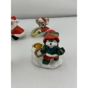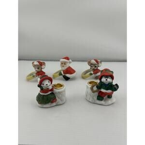 Unique set of Christmas candle decor. A set of two House of Lloyds Mini taper candle holders in the shape of woodland creatures in Christmas clothing. They were made in China. The set also comes with 3 Korean made Candle huggers. They are meant to hang onto a taper candle. There are two mice ones and one santa. They date to the late 70s to 80s. They are made of porcelain. They are in excellent vintage condition with no damage. They measure about 1.75" tall and 1" wide.