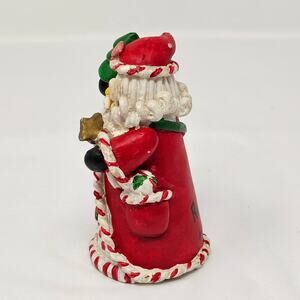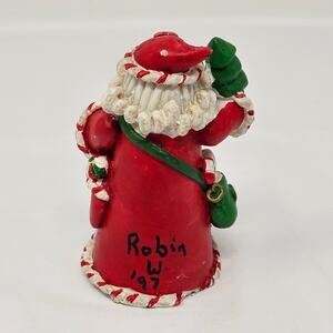Vintage Santa Claus Christmas decor figurine is made from a resin type material. He has a few flaws but is still as adorable as ever and is the perfect size for a tier tray measuring approximately 3.5 inches tall. NOTE: there is a chip along the bottom edge, a paint chip on hat and personalized writing on the back as shown in the photos.
