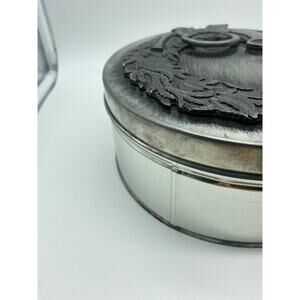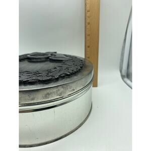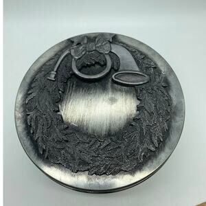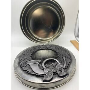 Vintage Christmas Tin Pewter Wreath Horn Trumpet Candy Cookies 5.25” Metzke