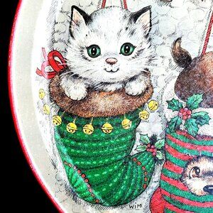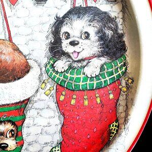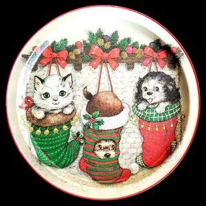 A kitten and puppies in stockings adorn this vintage metal Christmas cookie tray, adding charm to holiday displays or serving snacks! A wonderful gift!
