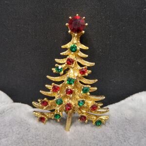 This festive mid-century Christmas tree brooch dates to the 1950s–1960s and is beautifully crafted in gold plating with sparkling red and green rhinestones as "ornament lights." The textured openwork design captures the look of a decorated holiday tree, topped with a brilliant red rhinestone “star.”