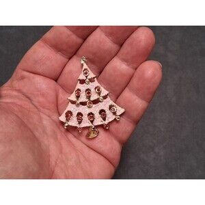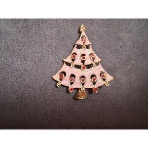 Vintage Christmas Tree Brooch Gold Tone Pink Glitter Red Glass Rhinestones