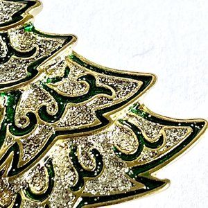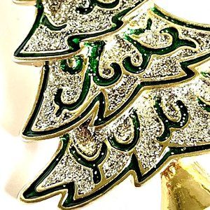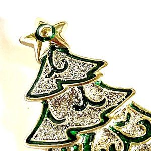 Vintage Christmas Tree Brooch Pin Green Enamel Glitter Gold Tone Plated