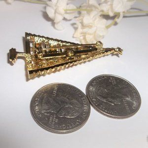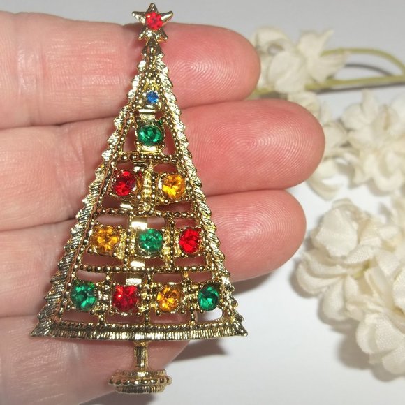 This pre-owned vintage brooch is a must have! It has a gorgeous gold tone textured Christmas tree pin has red, green, blue and gold rhinestones on it. Triangle shaped. The maker’s mark © B. J. is on the bottom back. It is a mark from the Beatrix Jewelry Company which closed in l983. This mark was used after 1975. Measures 2 1/4 inch tall and 1 1/4 wide. The pin is in very good vintage condition but it does have a little dis-colorization on the sharp end of the stick pin probably from age and use. Some of the stones have minor chips in them which are only visible through a jeweler's loupe. Without magnifying it you wouldn't notice this. Stones are nice and sparkly. Clasp is in good working condition. Would make a fabulous Christmas gift idea for her. It is really pretty in person. Would be beautiful pinned to a shirt or even a coat lapel. Very festive and merry. Buy it now before someone else does!
