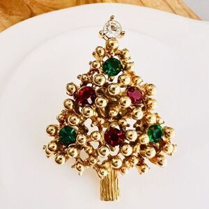 Vintage Christmas Tree Holiday Brooch Pin Gold Tone Multicolor Rhinestones 1151