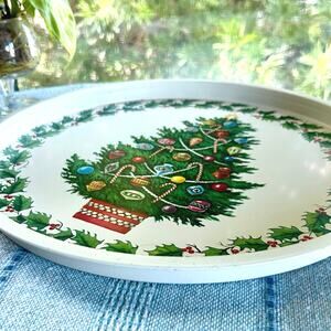 Add festive charm to your holiday entertaining with this vintage Christmas tree serving tray. Made of sturdy metal, it features a beautifully decorated Christmas tree at the center, surrounded by a holly and berry border. Perfect for serving drinks, cookies, or displaying as part of your seasonal décor.