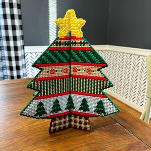 Vintage Christmas Tree Needlepoint Plastic Four Sided Folk Art Completed