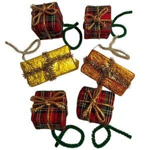 This ornament set combines classic holiday themes like candy canes, striped balls, plaid and gold gift boxes, and a decorative red bird. Ideal for holiday decorating.