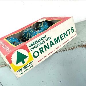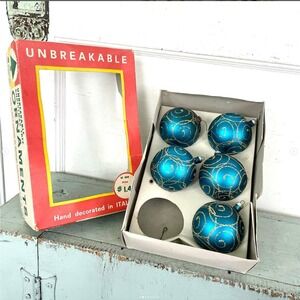 Vintage Christmas Tree Ornaments Plastic Hand Decorated Italy Box Blue SET5